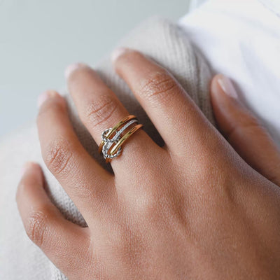 The Transcend Triple Band Ring brings together three distinct finishes in one seamless design. Two smooth gold bands wrap around a textured silver band with diamond-cut detailing, creating a soft shimmer and dynamic contrast.