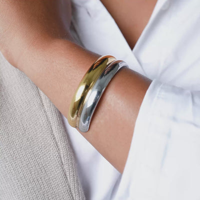Bold, twin-layer cuff in gold and silver that sculpts the wrist with effortless power.